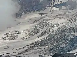 Carbon Glacier is located on the north slope of Mount Rainier in the U.S. state of Washington and is the source of the Carbon River.[2] The snout at the glacier terminal moraine is at about 3,500 feet (1,100 m) above sea level, making it the lowest-elevation glacier in the contiguous United States.[3] The glacier also has the greatest length (5.7 miles (9.2 km)), thickness (700 ft (210 m)) and volume (0.2 cubic miles (0.83 km3)) of any U.S. glacier outside of Alaska.