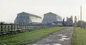 The establishment of an airship factory in Cardington by Short Brothers during the First World War increased passenger and freight traffic through the station. This continued after the war when the coalition government approved a project to build two large airships, the R100 and R101; the R101 was built at Cardington, the R100 in Yorkshire. This required the construction of two large sheds at what was then known as the Royal Airship Works.[5] The inter-war years saw a decline in traffic with the introduction of buses between Bedford and Hitchin. Traffic picked up again during the Second World War when the site became RAF Cardington particularly when troop specials were run to enable conscripts to travel forward to their basic training camps. The introduction of railbuses after the war did little to improve traffic, and the line closed in 1962.[6]