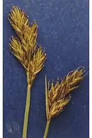 The open inflorescence is a cluster of several golden to brown spikes, their flowers covered with reddish-brown, white-edged scales. The fruit is coated in a winged, curved, light-colored sac called a perigynium.