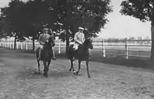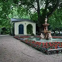 One year before they moved in, their longed-for daughter Wera was born in 1897 (died April 9, 1943, in London), who later married Richard von Szilvinyi. May von Weinberg was famous in Frankfurt as a philanthropist.[5] A chapel was established in the house for the Roman Catholic May. Later, the Niederrad chaplain Georg Nilges celebrated Sunday services in this house chapel. Carl von Weinberg donated a considerable amount for the Niederräder parish Mother of Good Counsel for the construction of a new church.[6] The Italian Renaissance fountain (Florentine fountain) of the house destroyed in the air raids on Frankfurt am Main in World War II has stood since 1952 in the garden of the Nebbienschen Gartenhaus, an artists' meeting place in the Bockenheimer Anlage in downtown Frankfurt. In 1908, the Weinberg brothers were nobilitated.