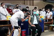Secretary Galvez, National Policy Against COVID-19 chief implementer and vaccine czar, receives the CoronaVac vaccine at the UP-PGH in Manila in March 2021.
