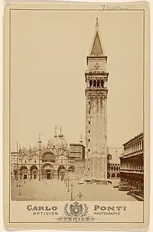 Ponti opened an optician’s shop in Piazza San Marco 52,[4][5] near the Caffè Florian,[6] producing high quality instruments, for which he had sole rights, for astronomy and physics and photographic lenses, especially those used for panoramas, as well as selling products of other companies.[3] On 30 May 1854 he was awarded a silver medal for his photographic equipment at the Esposizione Industriale Veneta.