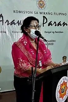 Carmelita Abdurahman in 2020 as newly designated commissioner for Waray language of Samar-Leyte delivering speech inside the hall of Komisyon sa Wikang Filipino
