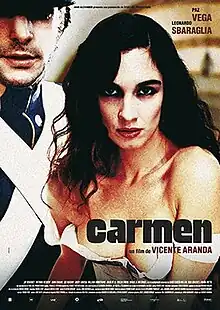 Carmen is a 2003 Spanish drama film directed by Vicente Aranda. The script was written by Aranda and Joaquim Jordà adapting the classic romance of the same name by Prosper Mérimée. Director Vicente Aranda based the plot on Mérimée's original 1847 novella about jealousy and passion, not its famous operatic adaptation by Bizet from 1875, changing some details about the love story between Carmen (Paz Vega) and José (Leonardo Sbaraglia). As in the novella, author Mérimée (Jay Benedict) is portrayed as a French writer who finds the "real" Carmen in early 19th century Spain.