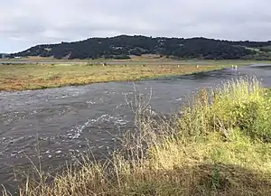 Carneros Creek is a westward flowing stream and is the primary source of freshwater flowing into Elkhorn Slough.[3] The Carneros Creek official mainstem is 9.8 miles (15.8 km) long.[2][1] Its source is in the northern Gabilan Range along Highway 101/156. After it waters transit Elkhorn Slough, the historic mouth of the Salinas River, Carneros Creek empties into Monterey Bay at Moss Landing, California.