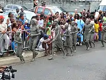 Neg'Marrons are groups of men dressed in kalimbé (red loincloth) and coated with molasses.[3] Representing fugitive slaves, they seek to make order of the festival.