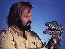 Promotional photo of John Carl Buechler with his Deinonychus puppet.