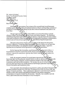 20. "Naval Officer's Letter Accuses Newspaper Reporter of Sexual Harassment". Fox News. 2009-07-25. Archived from the original on 2012-10-23. The letter — the online copy isn't written on official letterhead — alleges that on "multiple" occasions in the last year, reporter Carol Rosenberg "made abusive and degrading comments of an explicitly sexual nature" against Gordon and others at Guantanamo Bay and Andrews Air Force Base.
