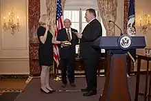 Secretary of State Mike Pompeo ceremonially swears Perez in as Director General of the Foreign Service and Director of Human Resources in 2019