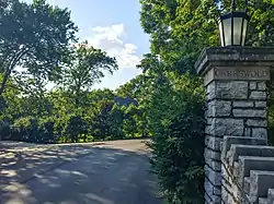 The entrance to the neighborhood is marked by stone pillars topped with lights, as well as a stone pavilion which served as a waiting area for the streetcar that formerly ran down Wydown Boulevard.[2] The neighborhood's street is laid out in a large oval shape that contains common areas jointly owned by the residents. Of the 23 homes in the neighborhood, 15 were designed by the architecture firm Maritz & Young in styles including Colonial Revival, Georgian Revival, and Tudor Revival.[2]