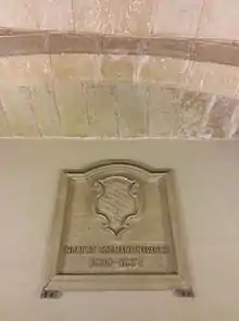 Cosmana died on 30 January 1687 when she was 87 years and was interned at the San Anton Chapel, that is found inside the St. Paul Parish Church. Her ambitious plan for the reconstruction of the parish church was finished before her death. In remembrance of her as the founder and philanthropist of the parish church there are at least two art works depicting her inside the church; one features her next to Casa Cosmana Navarra and the parish church. Significantly these paintings feature: the side patio (Zuntier) of the parish church and the designs (plans) of the church in her hands.[23] These images were intentionally painted to convey a message of her being the projects' main philanthropist; it significantly lead to her house, Casa Cosmana Navarra, to be featured first inside the church as a painting, and secondly (after demolishing several other houses to build the church’s patio) physically let her house featuring in an outstanding position next to the church.[24][25] In 1735, artist Gio Nicola Buhagiar, was commissioned to paint her of which painting is found in the sacristy of San Anton Chapel where she rests.[26] The family's coat-of-arms features on several objects and places such as on Cosmana's tombstone and painting at the Parish Church, on silver artifacts which she left as dowry to the Roman Cathoclic Church in Malta and on the inside of Casa Cosmana Navarra's main entrance door.[27][28][29] Costmana wrote her doury in 1675 with local notary Nicola Allegretto.[30][31]