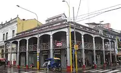 La Casa de Fierro is one of the finest as well as best-preserved samples of civil architecture in Peru. The walls, ceiling, and balcony are plastered in rectangular sheets of iron. It is said to be the first prefabricated house in the Americas.[1] Although popularly said to have been designed by the French architect Gustave Eiffel, there is no evidence at all that this is true; the building does not reflect his architectural style.[2] Since 2011 well substantiated claims prove it was built in the Belgian workshops of Les Forges d'Aiseau (Joseph Danly process).[3] Rubber baron Anselmo del Aguila bought it at the International Exposition of Paris in 1889.[4] Once dismantled, it was brought in pieces to Iquitos (the metal sheets were carried by hundreds of men through the jungle), and assembled there in 1890.[4]