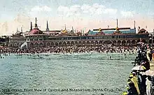 The Santa Cruz Railroad opened in 1874, but Santa Cruz did not become a resort destination. The Santa Cruz Railroad became part of the Southern Pacific Railroad in 1881. Santa Cruz became a resort in 1887, when the railroad shorted the line to Santa Cruz. Fred W. Swanton first built a casino, Neptune's Casino, and a beach tent city in 1904. The Casino offered 500 beach dressing rooms, a theater, a cafe, seaside grill, ballroom and roof gardens. The Casino was designed by architect Edward L. Van Cleeck The Casino was a bar with entertainment and gambling was never legal there. But it was widely known visitors could find boats at the pleasure pier, now called the Santa Cruz Wharf, to take them out in ships into the harbor to gamble in the 1910 and 1920s. Swanton built an amusement park near the pier, some calling it the Coney Island of the West. In 1911 Charles I. D. Looff family built a Merry-go-round carousel and in 1924 the Giant Dipper roller coaster.. Both the Santa Cruz Looff Carousel and Roller Coaster are National Historic Landmarks.[4][5] The Casino changed its name to Cocoanut Grove from 1920 to 1933 during prohibition. On June 22, 1906, a fire started in the kitchen, destroyed the complete casino. Swanton hired William Henry Weeks and a new Casino was built and the Plunge Natatorium pools. At the same time, a new Cottage City was built for guests. The new Casino, Plunge and Cottage brought many new guests to the Santa Cruz Beach Boardwalk by the end of 1907. The Cottage City, was designed as a residential hotel for long summer stays. But, there was a great need for a regular hotel. The hotel was served by a Horsecars offered tram service that started in 1876. The Santa Cruz, Garfield Park, and Capitola Electric Railroad service in 1881. The Union Traction Company consolidated the three electric tram service routes in 1904. One service line ran from DeLaveaga Park along Water Street and Pacific Avenue to the beach. Another from Ocean Cliffs to the hotel along what would become CA Route 1. The third line through Seabright to Capitola was completed in 1906. With more and more automobiles in use, the streetcar service ended in 1926. The Southern Pacific Railroad ran a summer excursion train, called Suntan Special, between San Francisco and the hotel from 1927 to 1959.[6][7][8] The ballroom in the Casino has hosted nightly bands and dance since it opened. In 1924 Isham Jones's band played jazz, in the 1930s and into the 1950 Big Bands-Jazz play like: Artie Shaw, Ted Fio Rito, Lawrence Welk, Benny Goodman, Skinnay Ennis, Paul Whiteman, Billy May, Tex Beneke, Les Elgart, Hal McIntyre and Si Zentner. In the 1960s the ballroom had artists Nat King Cole Sonny and Cher, the New Christy Minstrels and The Four Freshmen.[9][10] From 1924 to 1965 the Miss California Pageant took place at the Casino's Boardwalk.[11] Many movies and TV shows have been shot on the Casino's Boardwalk: Sudden Impact, Mr. Peabody and the Mermaid, America Screams, and The Lost Boys.[12]