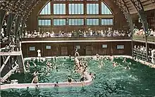Built in 1907 on the Santa Cruz Beach Boardwalk, the Plunge Natatorium was an indoor swimming pool that used heated Monterey Bay Pacific Ocean salt water. The main swimming pool was 144 feet by 64 feet and had a 40-foot slide. The two pools held 408,000 gallons. The pool was refilled and heated to 83 degrees each night. An added attraction was the Water Carnival. The Water Carnival had entertainment like: Ruth Kahl, known as the human submarine, a world record holder for deep underwater swimming down to 303 feet; Dido Scettrini, Shirley Wightman and Harry Murray all human submarines, flying trapeze artists; fire divers; Stratosphere Plungers; water ballets; Duke Kahanamoku an Olympic swimmer and surfer; fire dives; Don "Bosco" Patterson log zip line rider, swimming team races and other exhibitions. Later called The Plunge or the Santa Cruz Swimming Pavilion. Natatorium opened in 1907 and closed in 1963. On the old site a miniature golf course was built. After the remodel, some structural features of the old pool were still visible on the outer edges of the mini-golf course. After the 1989 Loma Prieta Earthquake this mini-golf course was replaced with a new one, called in Neptune's Kingdom[13][14][15][16][17][18][19]