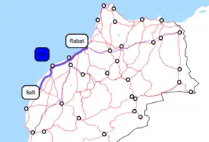 The route starts at the centre of Casablanca, and then joins the Casablanca bypass at the junction just before the west Mohammedia interchange. It continues past the east interchange serving Mohammedia before reaching the toll station at Bouznika. After passing Skhirat and Aïn Atiq the road reaches Temara on the outskirts of Rabat. Traffic going to Fes and Tangier then exit at Hay Riad to converge onto the non-expressway Rabat bypass. The motorway regulations end just before the entrance to the city at the Prince Moulay Abdellah sports complex.