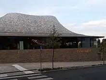 The main hall seats an audience of 550, the Bechstein hall seats 150, and a study centre is located in an adjacent building.[2][3][5] Per the requests from the acoustic engineer, the architect designed the hall in a free form with curved convex and concave walls, to spread the sound widely.[3] Walls in the hall are covered by light-brown wood. The curved space is reminiscent of the shape of a stringed instrument, and musicians said after the first rehearsal that "it felt and sounded as if you were playing inside a violin" ("es fühle sich an und klinge so, als ob man im Inneren einer Geige spiele").[6] On the top level, a front of fanned glass panes offers views of the park.[10] The climate control is efficient by an innovative storage technology for climate-neutral operation.[5][10]