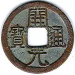The Zhouyuan Tongbao (周元通寳) series of cash coins produced by the Later Zhou has been favoured by practitioners of traditional Chinese medicine for its supposed "medicinal properties".[16] This series of cash coins is often considered to be of "very high quality" because it was cast using the metal taken fro confiscated Buddhist statues from 3,356 Buddhist temples.[34][16][35] For this reason the Zhouyuan Tongbao is commonly referred to as "Arhat money" (羅漢錢). These cash coins were believed to have spiritual powers inherited from the Buddhist statues, and were subsequently much-copied.[36][37]