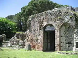 Casinum was an ancient town of Italy, of Oscan[1][2] origin. Varro states that the name in Oscan language meant forum vetus ("old forum"), and also that the town itself was Samnite before the Roman conquest.[3] Casinum was a Samnite city only before the Roman conquest and it is difficult to reconstruct the history in the intermediate period, between Oscans and Samnites, when it had been occupied by the Volsci.[4][5] When it came under Roman supremacy is not known, but it probably received the citizenship in 188 BC. It was the most southeasterly town in Latium adiectum, situated on the Via Latina about 40 miles north-west of Capua. It appears occasionally in the history of the Hannibalic War.[6] Varro possessed a villa near it, in which later on Mark Antony held his orgies.[7]