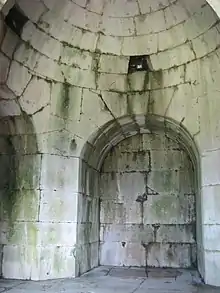 Above it on the hillside is a theatre of opus reticulatum, less well preserved. Close by is a building converted into the Cappella del Crocefisso, originally perhaps a tomb in the Via Latina; it is a chamber in the form of a Greek cross, constructed of large masses of travertine, with a domed roof of the same material. On the opposite bank of the Rapido are the ruins called Monticelli, attributed to the villa of Varro, a part of which was frequently drawn by the architects of the 16th century.[7]
