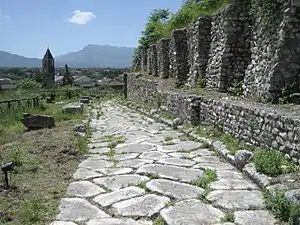 Towards the end of the republic it was a praefectura, and under the empire it appears as a colony (perhaps founded by the triumvirs), though in two (not local) inscriptions it is called municipium. Strabo speaks of it as a relevant center, the last city of the Latins;[8] Varro mentions the olive oil of its district as especially good. The older Volscian town must have stood on the summit (1,715 ft) above the Roman town (148 ft), where considerable remains of an acropolis with walls in Cyclopean masonry, finely cut blocks of limestone, still exist.[7]