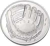 She then settled on the simple baseball glove as the main motif of her design due to its inherent Americana and nostalgic appeal. It also made effective aesthetic use of the concave shape of the coin's obverse.[2] The 2014 National Baseball Hall of Fame commemorative coin is the first scyphate coinage ever produced by the U.S. Mint, as authorized by Section 3(d) of the 2014 National Baseball Hall of Fame Commemorative Coin Act.[8]