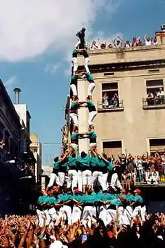 The Castellers de Vilafranca (Catalan pronunciation: [kəstəˈʎez ðə βiləˈfɾaŋkə]) is a cultural and sporting association whose main objective is to build castells (human towers). It has the status of a public-interest association. The group was founded in 1948[1] in response to the increased interest in human tower building in Vilafranca del Penedès, a Catalan tradition that has evolved since the 18th century Ball de Valencians, a dance from Valencia.[2][3]