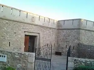Castillo de las Escobetas ("Castle of the Nazarene") is located 3.25 miles (5.23 km) northward of Cantal Point,[1] in the town of Garrucha, Almería province, in the autonomous community of Andalusia, Spain. The fishing village of Garrucha suffered at the hands of Berber pirates until the year 1766 when barracks were built at Escobetas, a provisional military building which cost 13,970 reais. In 1769, the castle was completed at a cost of 181,000 reais. The fort was designed by the architect Francisco Ruiz Garrido. After its construction, Garrucha began to grow. It is of masonry construction in three section. The central portion is rectangular with rounded short sides. Attached to the right lateral side, there is a truncated pyramid shape with sloping walls. In its upper part, a parapet is pierced with loopholes. The main body is attached to the left side, of lower height, without openings. It is accessed by an external staircase and one tranche that attaches to the right side. In 1963, the Ministry of Culture declared the site a Bien de Interés Cultural monument.