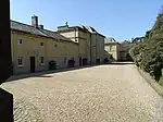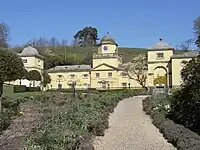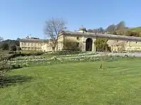 The stable block, viewed from the east. The main vehicular entrance to the house is through the large arch along a road which passes directly in front of the service block, the clock tower of which can be seen behind. The main range is visible to the left (south)