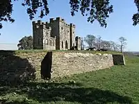 A sham castle dating from about 1746, occupies the hill behind the house to the north, possibly inspired by Vanbrugh, and is said to be the feature which gave the house its name. When Lord Lieutenant of Devon, Hugh Fortescue, 4th Earl Fortescue (1854–1932) flew the Fortescue standard from the castle, and noted in his diary that his ancestor Matthew Fortescue, 2nd Baron Fortescue (d.1785) had "armed" it, as a modern reference to which in 1991 Lady Margaret Fortescue installed the decorative cannon now present on its south lawn. It served for a while as a banqueting hall, at which time it was lined with oak panelling from nearby North Aller House, which in 1812 was moved on to Weare Giffard Hall. The building was later converted into a dwelling house, originally intended for a couple to tend the tame pheasants, and later lived in by the huntsman of the Fortescue Harriers, Abraham Moggeridge. From the castle can be seen to the west Lundy Island and at a closer distance, Bampfylde Clump to the north in North Molton parish.