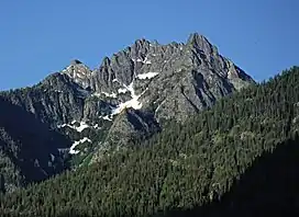 During the Pleistocene period dating back over two million years ago, glaciation advancing and retreating repeatedly scoured the landscape leaving deposits of rock debris.[4] The U-shaped cross section of the river valleys is a result of recent glaciation. Uplift and faulting in combination with glaciation have been the dominant processes which have created the tall peaks and deep valleys of the North Cascades area.