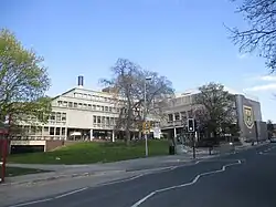 The council organised a competition in 1964, which was won by the Griffiths Lewis Goad Partnership,[5] described by Nikolaus Pevsner as a firm of "three very young architects".[6] The winning design offered two large function rooms, the largest with a capacity of 700 people.[7] The building was designed in the Brutalist style and clad in pre-cast concrete. The first phase of the building, consisting of the offices and events venue, was opened by Katharine, Duchess of Kent on 14 March 1970.[8] The proposed second phase, a council hall, was never built.[7] Sculpture for the building was commissioned from Diana Dean.[9]