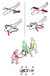 Then, one extremity of the strap goes on a shoulder of the team member and under their opposite armpit (it crosses the back), and is tied to the other or held together by the team member; a hand is also put under the neck to support the head.
