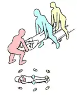 It is also possible to use a roll-and-lift method, or "spoon" lifting (relevage à la cuiller in French), with three people: