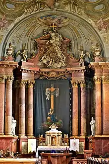 The church was built in Baroque style, between 1758 and 1768. The choir and the altar were designed by the famous Austrian architect Franz Anton Hillebrand. The interior frescoes depict scenes from the life of King Stephen I, and the altarpiece represents the Stephen king kneeling in front of the Mother of God and was made by Vinzenz Fischer, while the imposing ceiling frescoes are from Johann Cymbala.