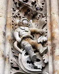 • Astronaut. In the Puerta de Ramos (north), in front of the Palacio de Anaya, there is an anachronistic figure of an astronaut sculpted on its left flank. On the occasion of Salamanca hosting the exhibition Las Edades del Hombre in 1993, it was decided to restore the door, which had deteriorated greatly due to the passage of time. During this restoration, the astronaut was carved in stone in 1992 by stonemasonry Miguel Romero, following the tradition of incorporating a contemporary element in each restoration. On September 20, 2010 it appeared with a broken right arm due to an act of vandalism.