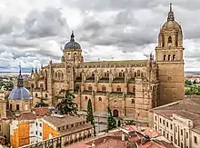 The Catedral de la Asunción de la Virgen (Cathedral of the Assumption of the Virgin Mary), popularly known as New Cathedral (Spanish: Catedral Nueva) is, together with the Old Cathedral, one of the two cathedrals of Salamanca, Castile and León, Spain. It is the seat of the diocese of Salamanca. It was constructed between 1533 and 1733 mixing late Gothic, Plateresque and Baroque styles. It was commissioned by Ferdinand V of Castile. It is one of the largest cathedrals in Spain in size and its bell tower, at 92 meters high, is also one of the tallest.