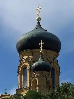 The building was built on a Greek cross, covered with a hipped roof. The church has five onion-domes with Orthodox crosses, located on octagonal drums. Side drums at the same time have a bell tower with ten bells cast in Westphalia. All the windows in the building are semicircular decoratively framed motifs and columns. Drums, below the roof, are decorated with rows of arcs. Originally on the west wall of the church, in Tondo form, Vinogradov was a composition depicting Christ surrounded by Saints Cyril and Methodius. On the eastern wall, the same artist painted Anthony and Theodosius Pechersky in Tondo form. On the northern wall is the image of the Mother of God based on the Kazan Icon of the Mother of God, Holy Martyrs characters, Catherine and St. Alexandra, and on the south - Saints Helen and Olga. All these images have been degrading gradually and don't survive now.