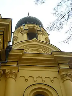 The main entrance to the church was located on the west with a closed semicircular portico with double half-columns situated on pedestals. Over the portico is a forged window with a decorative border, below which are three empty Tondo. The entire west facade repeats the shape of the portico. The entrance to the lower church, located below the main church, is on the south side. From the east, the church has an apse with a row of semi-circular windows. In a bay is an image of the patron saint of the church.
