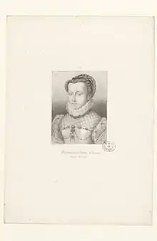 Catherine-Marie de Lorraine (or de Guise) was born on 18 July 1551.[1][lower-alpha 1] She was the second child of Francis, Duke of Guise, and Anna d'Este. Her elder brother was Henry I, Duke of Guise (1550–88), known as the Balafré. Her younger brothers included Charles, Duke of Mayenne (1554–1611) and Louis II, Cardinal of Guise (1555–88). She grew up during the French Wars of Religion, a civil war between Protestant and Catholic factions. In 1570 she married Louis, Duke of Montpensier, of the Bourbon family.[2]