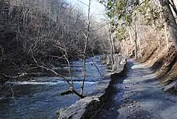 The Cedar Creek Trail runs alongside Cedar Creek for one and a quarter miles (2 km), allowing visitors to see the bridge and other places of interest, including a Native American village, Saltpeter Cave, the Lost River, and Lace Falls.