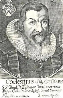 Celestyn Myślenta (also Mislenski; 27 March 1588 in Kuty (Kutten), Ducal Prussia – 20 April 1653 in Königsberg (Królewiec)) was a Polish Lutheran theologian and rector of the University of Königsberg. Celestyn was the son of Mateusz Myślenta (also Myslonius) and Eufroza née Wiercinska. His father was once employed by Duke Radziwill and belonged to the Polish nobility. As a stipendiary of the duke of Prussia he studied at University Königsberg, then became Lutheran pastor in Kuty from 1581-1599.[1]