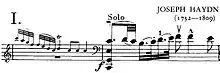Although the full work was discovered in 1961, Haydn had written the beginning of the principal theme of the first movement in his draft catalogue of 1765.[2][3] This early work, nearly contemporaneous with symphonies 6, 7 and 8 and predating his D major cello concerto by around twenty years, already shows Haydn as a master of instrumental writing. The solo cello part is thoroughly idiomatic. The concerto reflects the ritornello form of the baroque concerto as well as the emerging structure of the sonata-allegro form. As in the baroque concerto grosso, the accompanying ensemble is small: strings, two oboes, and two horns.[1] It is possible that Weigl was the only cellist in the Esterházy Orchestra when Haydn composed the concerto, since there is only one cello line in the score, marked alternately “solo” and “tutti.” There is also, however, a basso continuo line, that might have been played by another cellist, or by Haydn himself on the harpsichord, or by a string bass player.