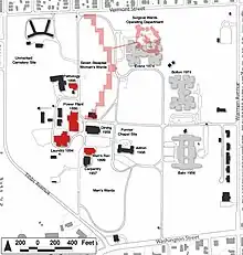 As of December 2022, only three of the original structures remain: the 1886 power plant, the 1895 pathology building, and a building of unidentified use.