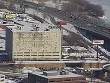 The Central Warehouse is a former warehouse building in North Albany, a neighborhood of Albany, New York. The building was a refrigeration warehouse built in 1927, 11 stories tall, with 40,000 square feet (3,700 m2) of space. The structure is considered a landmark of the community and city.[1] The building has a rail line that enters the second floor and the walls are 3 feet (0.91 m) thick concrete.[2] In 1981 the building began to have signs placed on it seen from I-787, and in 1983 one in particular "Year of the Bible" received numerous complaints and the state began proceedings to have it removed. The signs violated the Federal Highway Beautification Act and were removed in 1986. Previous signs from 1981 to 1983 were not disputed by the state because Albany Mayor Erastus Corning 2nd had personally approved them and the New York State Department of Transportation (NYSDOT) chose not to enforce the law since it would be against Corning's wishes,[3] Corning died in 1983. In 1996 the building, which by then had been abandoned, was found to have up to 18 inches (460 mm) of ice built up on some floors. The ice was believed was keeping the ammonia of the refrigeration system from expanding, bursting pipes, and being released into the atmosphere.[1] The building was abandoned in the early 1990s.[4] The ammonia was subsequently drained from the pipes.[5] On October 22, 2010, a fire began in the warehouse and lasted for days, the current owners claimed no structural damage was done to the building and that plans to renovate the building into a residential and retail complex were still possible, over $1 million had already been invested in cleaning the insides of the building.[6] The City of Albany declared a state of emergency on July 29, 2022 after chunks of the building's concrete wall began to fall near the train tracks below. Amtrak, who uses this portion of the track for service west of Albany, temporarily suspended use of the track.[7] On August 1, after the city made emergency repairs to the crumbling wall, Amtrak resumed use of the track. The building's owner was billed by the city for the repair costs.[8]
