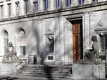 The original building by Lausanne-born George Épitaux was based on a classical Florentine villa, with an interior courtyard, grand entrance and a sweeping staircase leading up from the main entrance hall. The size of the first construction was 86.30 x 33.80 metres, with the top of the central cupola at 32 metres from the floor level. Entirely built in cement, some areas also include granite from Ticino and sandstone from Würenlos (Aargau). Épitaux hired renowned sculptors and artisans, including Luc Jaggi (1887–1976), Maurice Sarki (Sarkissoff) (1882–1946), León Perrin (1886–1978), and others. Immediately after the World War II George Épitaux was commissioned again to build two extensions to the north and south of the original building.[4] Geometric shapes and symbolic decorations were used in the extensions to provide esthetic consistency.
