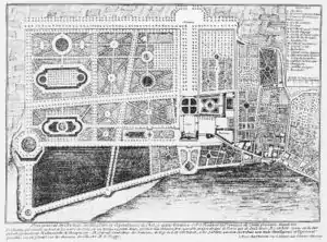 - ↑ "sans aucun ornement ni architecture." Mlle de Montpesier's own taste ruled: "If I had wished to read one of the books on the subject, I could have made a pretty description; but that would have been an affectation that suits me not at all." Mlle de Montpensier's authoritative taste may be detected in Le Nôtre's garden design (left), which quite uncharacteristically multiplies autonomous features without a broad unifying scheme. "I have planted many allées which are coming along very well" she remarked in 1680, but the reader scrutinizing the plan will notice that few of the allées begin or end at a place of great consequence, one sure mark of a strong-minded and enthusiastic amateur.