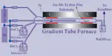 Phase change random access memory (PCRAM) has attracted considerable interest as a candidate for non-volatile devices for higher density and operation speed.[6][7] The ternary Ge2Sb2Te5 (GST) compound is widely regarded as the most viable and practical phase change family of materials for this application.[8] CVD techniques have been applied to deposit GST materials in sub micron cell pores.[9] Challenges include the need to control device to device variability and undesirable changes in the phase change material that can be induced by the fabrication procedure. A confined cell structure where the phase change material is formed inside a contact via is expected to be essential for the next generation PCRAM device because it requires lower switching power.[10] This structure however requires more complex deposition of the active chalcogenide into a cell pore. CVD techniques could provide better performance and enable the production of thin films with superior quality compared to those obtained by sputtering, especially in terms of conformality, coverage, and stoichiometry control, and allows implementation of phase-change films in nanoelectronic devices. In addition, CVD deposition is well known to provide higher purity materials and provides the scope for new phase change materials with optimized properties to be deposited.