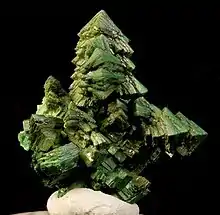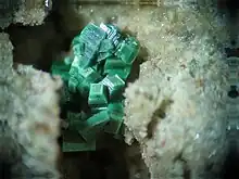 Torbernite, also known as chalcolite,[6] is a relatively common mineral with the chemical formula Cu[(UO2)(PO4)]2(H2O)12.[1] It is a radioactive, hydrated green copper uranyl phosphate, found in granites and other uranium-bearing deposits as a secondary mineral. The chemical formula of torbernite is similar to that of autunite in which a Cu2+ cation replaces a Ca2+ cation. Torbernite tends to dehydrate to metatorbernite with the sum formula Cu[(UO2)(PO4)]2(H2O)8.