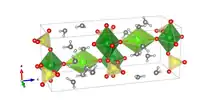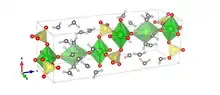 The crystal structure of metatorbernite is different from torbernite as every second uranyl phosphate layer is moved about one half of the length of the crystallographic a-axis in the directions [100] and [010].[1] The analysis by Locock and Burns confirms the finding by Stergiou et al., that the Cu2+ ions only have an 88% crystallographic occupancy. The authors assume that by protonation of some of the water molecules there is a charge compensation for electronic neutrality, as it is discussed with the mineral chernikovite.[1] The same is postulated by the same authors for autunite.[15] Due to the limitations of X-ray diffraction this postulate is practically not verifiable with this method.