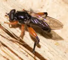 Chalcosyrphus (Xylotomima) plesia (Curran 1925), the Black-hipped Leafwalker, is an uncommon species of syrphid fly and a mimic of Sphex nudus. This fly is found in the northeastern United States and southeastern Canada. Hoverflies can remain nearly motionless while in flight. The adults are also known as flower flies for they are commonly found around and on flowers, from which they get both energy-giving nectar and protein-rich pollen.[2]